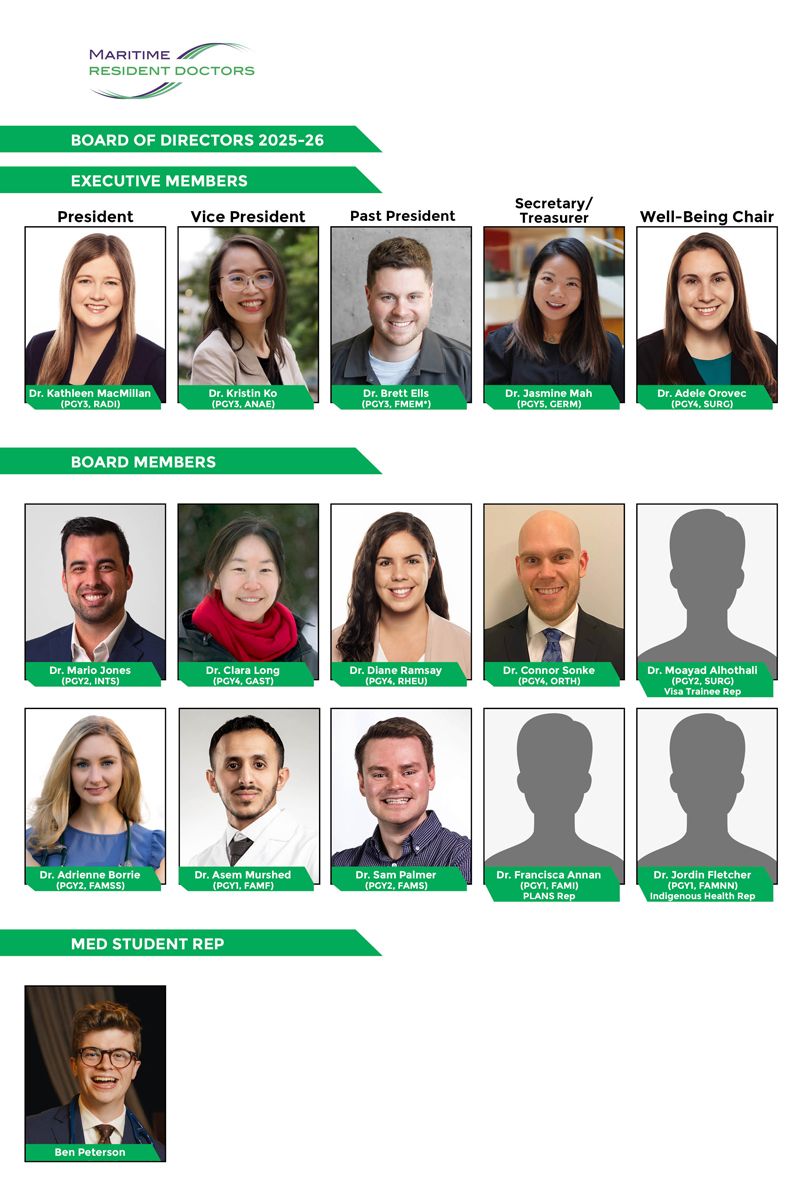 Board meetings are held, with some exception, on the first Tuesday of each month online or in the Maritime Resident Doctors office in the Halifax Professional Centre.